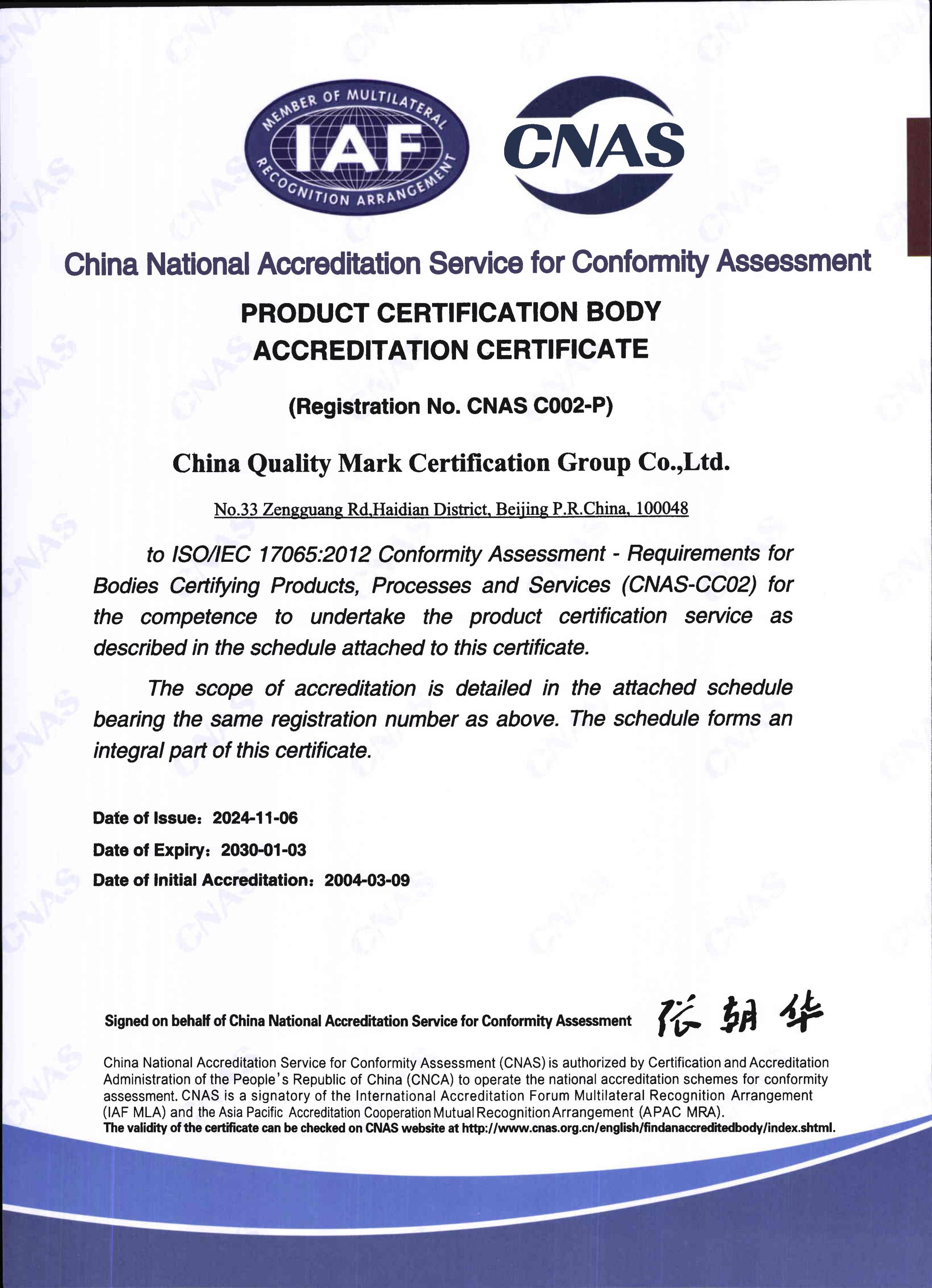 質量管理體系認證機構認可證書