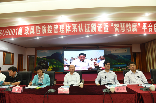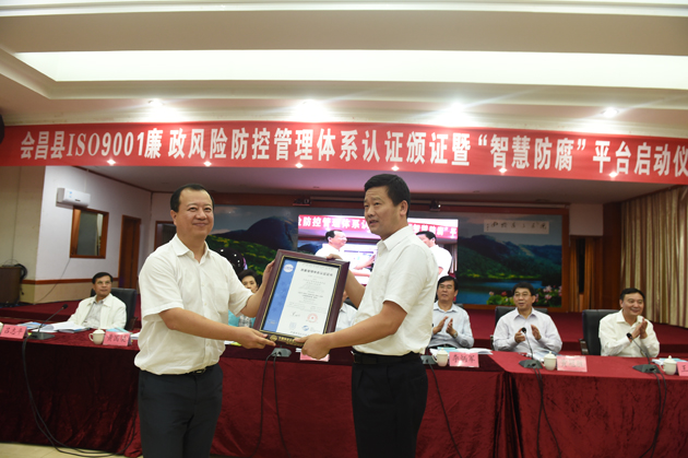 10月23日下午,江西省會昌縣舉行“基于質量管理體系標準的廉政風險防控管理體系”認證頒證暨“智慧防腐”平臺啟動儀式。在國家質檢總局局長支樹平,江西省委常委、贛州市委書記李炳軍,江西省副省長謝茹等領導的見證下,方圓集團董事長高建忠向會昌縣委、縣政府頒發了全國首張廉政風險防控管理體系認證證書。