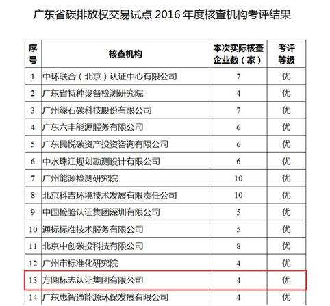 近日,為促進廣東省碳排放權交易有序運行,廣東省發展和改革委員會(以下簡稱“廣東省發改委”)根據《廣東省碳排放管理試行辦法》(粵府令第197號)、《廣東省發展改革委關于企業碳排放信息報告與核查的實施細則》(粵發改氣候【2015】80號)以及《廣東省碳排放信息核查工作管理考評方案(試行)》等文件,組織對廣東省碳排放交易試點2016年度核查相關工作考評,并于10月9日發布《關于印發廣東省碳排放權交易試點2016年度核查相關工作考評結果的通知》公布了考評結果,方圓標志認證集團有限公司及相關核查工作順利通過了廣東省碳排放權交易試點單位2016年度核查考評。