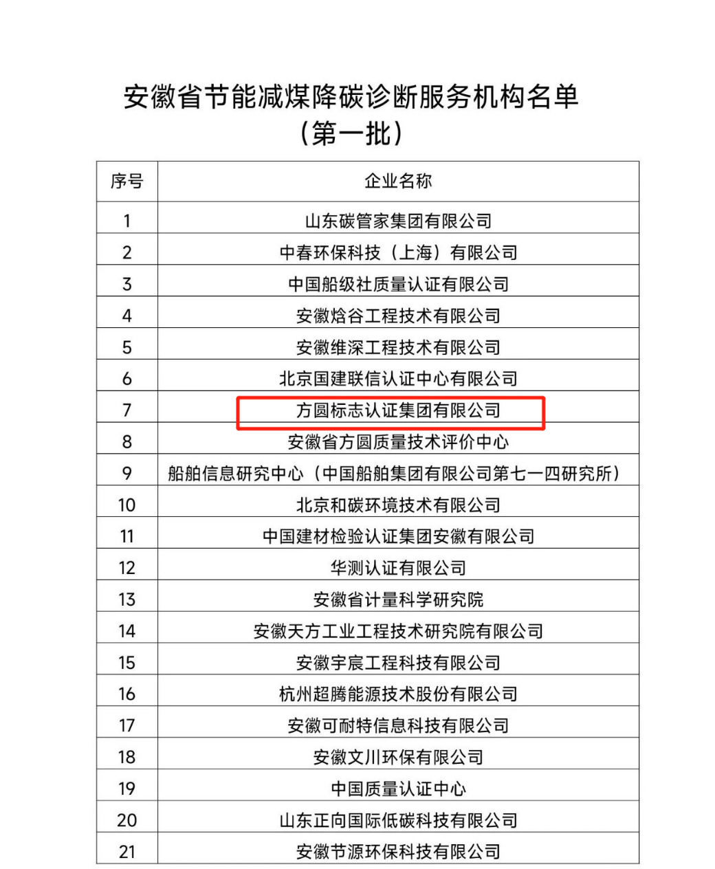 根據(jù)《安徽省發(fā)展改革委關(guān)于征集安徽省節(jié)能減煤降碳診斷服務(wù)機構(gòu)和合同能源管理合格供應(yīng)商的通知》要求,經(jīng)專家評審,方圓標(biāo)志認(rèn)證集團成功入選安徽省節(jié)能減煤降碳診斷服務(wù)機構(gòu)名單(第一批)。