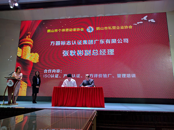 會(huì)上,在各界見證下,方圓廣東公司張耿彬副總經(jīng)理代表公司與鶴山市個(gè)體勞動(dòng)者協(xié)會(huì)、鶴山市私營(yíng)企業(yè)協(xié)會(huì)簽署戰(zhàn)略合作伙伴協(xié)議,公司將在認(rèn)證、管理培訓(xùn)、增值服務(wù)、二方評(píng)價(jià)等方面進(jìn)一步為鶴山各屆商企單位提供優(yōu)質(zhì)的技術(shù)服務(wù)。