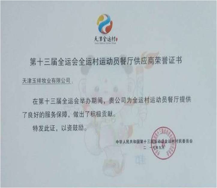 為保障第十三屆全運會全體參會人員安全用餐,經政府嚴格考核,方圓天津分公司兩家客戶天津市玉祥牧業有限公司、天津市月壇學生營養餐配送有限公司被列為全運會食品供貨商。