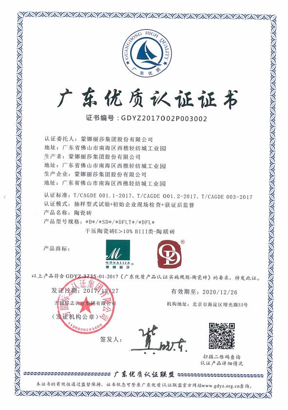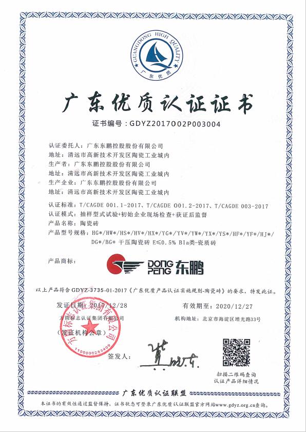 會議深入學習貫徹黨的十九大精神,總結了廣東優質品牌建設階段性成果,并由袁寶成副省長、薄昱民總工程師、任小鐵局長等領導向首批獲得“廣東優質”品牌認證產品的企業頒發了認證證書。方圓認證客戶廣東東鵬控股股份有限公司和蒙娜麗莎集團股份有限公司生產的陶瓷磚等9家廣東知名品牌企業的產品獲此殊榮,成為首批獲得“廣東優質”品牌認證的企業。