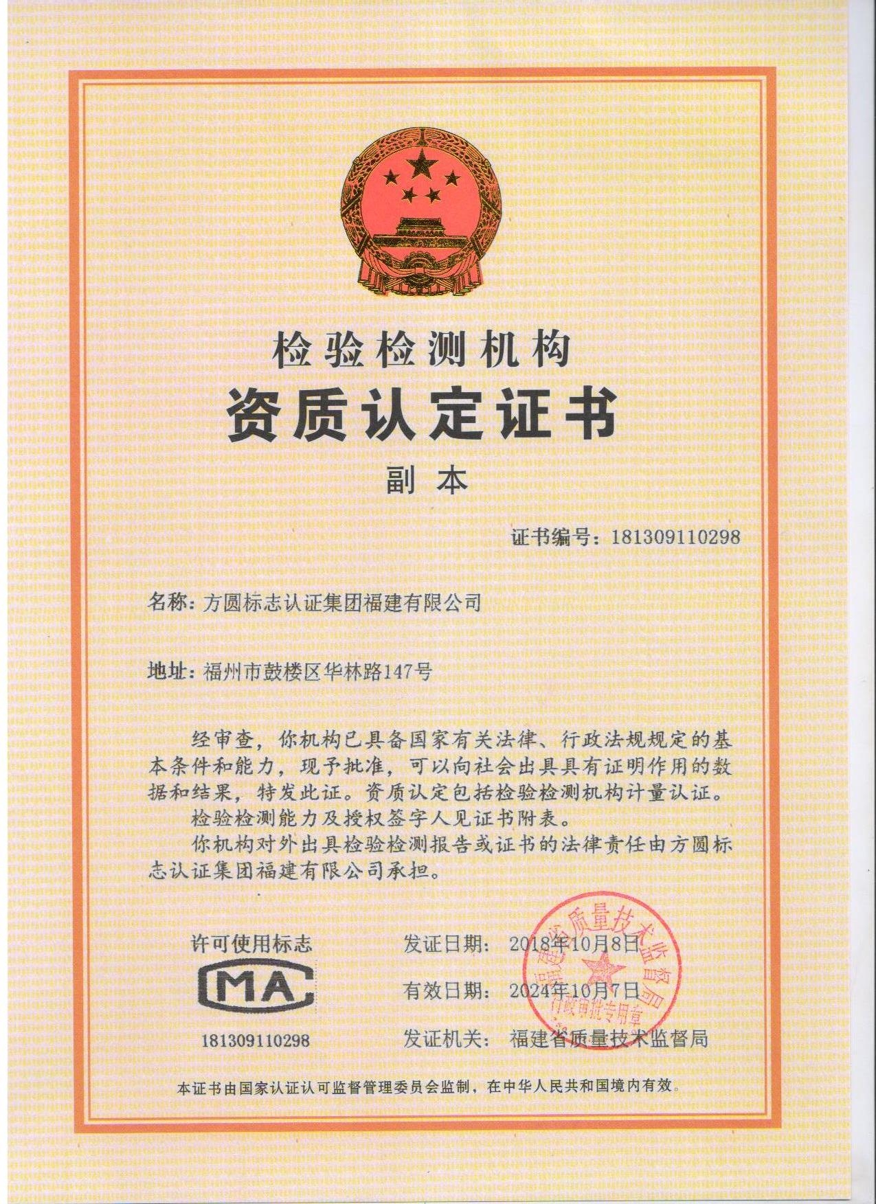 方圓福建公司獲得檢驗檢測機構資質認定證書
