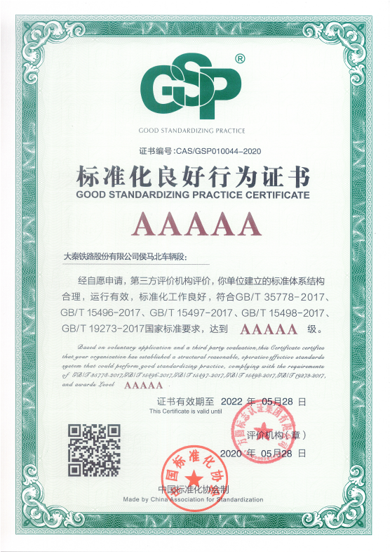 為進一步貫徹實施新版《企業標準體系》系列國家標準,助力建設推動高質量發展的標準體系,方圓山西公司積極推動“標準化良好行為企業”的宣傳工作。2020年5月,大秦鐵路股份有限公司侯馬北車輛段通過方圓集團公司企業標準化良好行為評價,并獲得AAAAA級標準化良好行為證書。