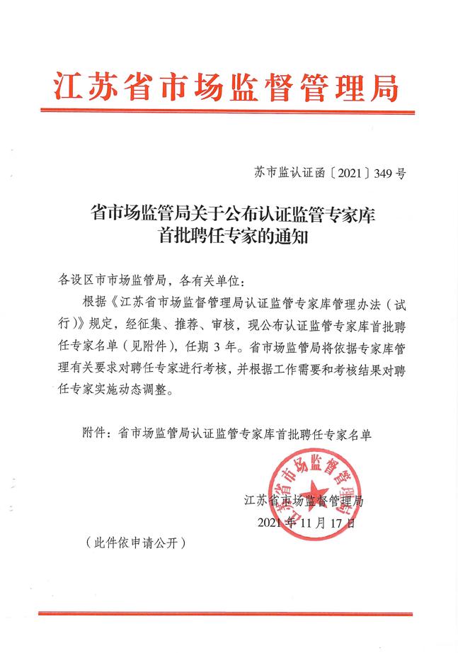 江蘇省市場監管局聘任方圓規劃研究(江蘇)有限公司陸凱總經理為江蘇省首批認證監管專家