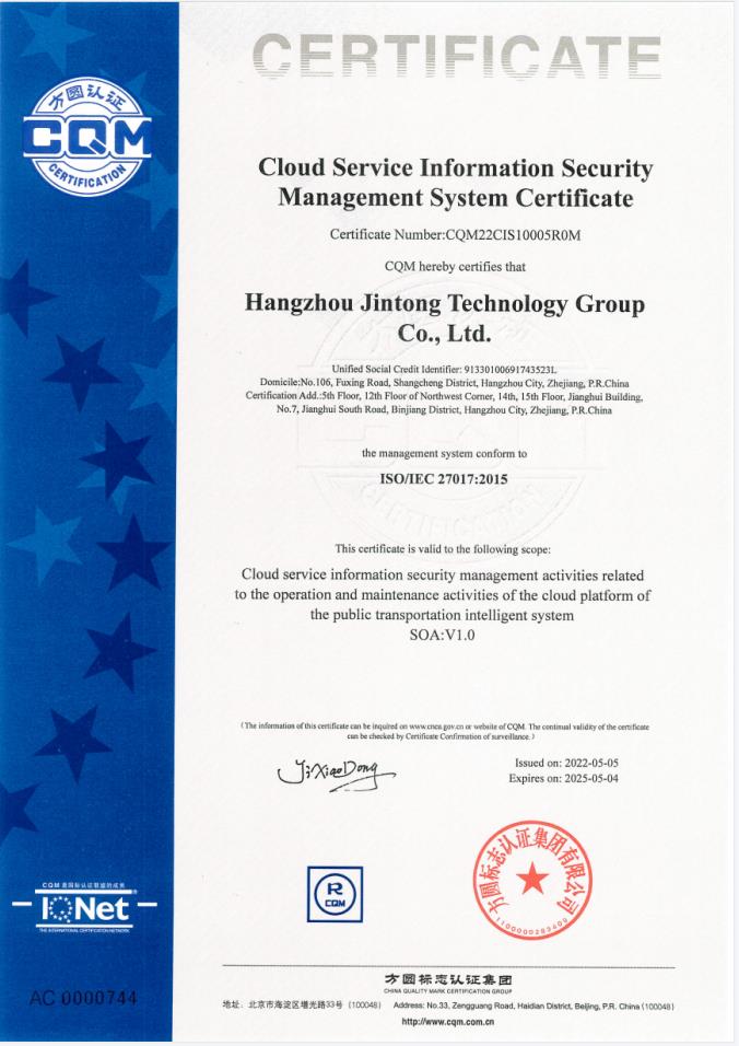 金通科技始創于2009年,由杭州公交集團控股,涵蓋智能化軟硬件開發、建設及整體運營服務,業務聚焦智慧單車、智慧公交和智慧停車,并以5G、云計算、大數據、AI等技術為驅動,為城市提供高品質、全方位的公共交通服務,讓低碳理念深入人心,成為國內領先的公共交通全域數字化一站式解決方案提供商。基于自我要求及為外部提供信任的需求,杭州金通科技集團股份有限公司向我司提出了進行ISO/IEC 27017:2015云服務信息安全管理體系的認證申請。