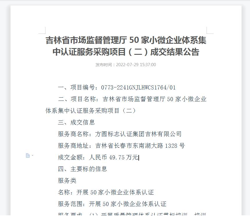 方圓吉林公司成功中標(biāo)吉林省市場(chǎng)監(jiān)督管理廳50家小微企業(yè)體系集中認(rèn)證服務(wù)項(xiàng)目