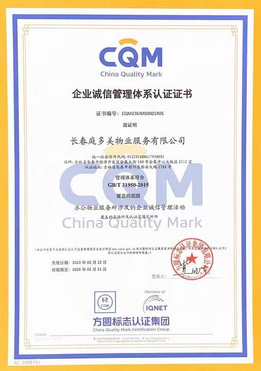 長春庭多美物業(yè)服務(wù)有限公司高度重視企業(yè)誠信管理管理體系建設(shè),嚴格按照GB/T39950-2015《企業(yè)誠信管理體系》要求開展體系的建設(shè)和運行工作。2023年2月,審核組經(jīng)過兩階段的認真審核,對其系統(tǒng)化開展企業(yè)誠信管理、推行企業(yè)誠信落地、提升企業(yè)誠信績效等方面給予高度評價,一致認為該公司企業(yè)誠信管理體系符合認證標準要求,體系運行規(guī)范有效。獲得企業(yè)誠信管理體系認證證書,有效提升了公司品牌宣傳價值,增加投標資格,有效防范企業(yè)信用風險。