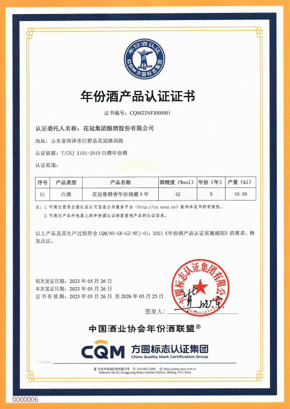 方圓標志認證集團聯合中國酒業協會組建的認證專家團對花冠酒業的生產資質、生產能力、檢測能力、技術人員、生產管理以及年份酒基酒存儲量和年份酒產品等進行詳細的現場查驗與論證。經過嚴格認證,花冠魯雅香年份儲藏9年產品正式通過認證,獲得方圓標志認證集團與中國酒業協會聯合頒發的年份酒產品認證證書和標簽,同時報國家認監委進行備案。